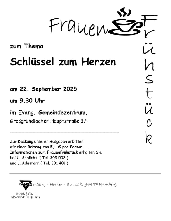 Frauen, die gerne die verschiedenen Bereiche ihres Lebens überdenken und mit anderen darüber reden wollen, sind herzlich eingeladen. Für die Auswahl der Themen und für das Frühstücksbuffet sorgt das Frauenfrühstücks–Team.