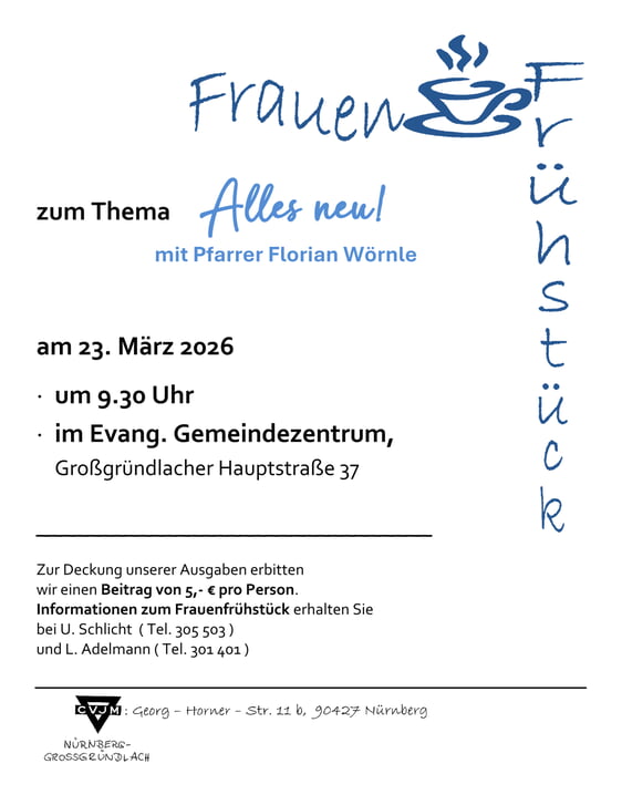 Jeden zweiten Monat montags findet das Frauenfrühstück von 09:30 bis ca. 12:00 Uhr im CVJM-Heim oder im Evangelischen Gemeindezentrum St. Laurentius statt. Wir sind offen für Frauen jeden Alters. Die genauen Termine entnehmen Sie bitte rechts. Weiterführende aktuelle Informationen zum jeweiligen Termin finden Sie hier.